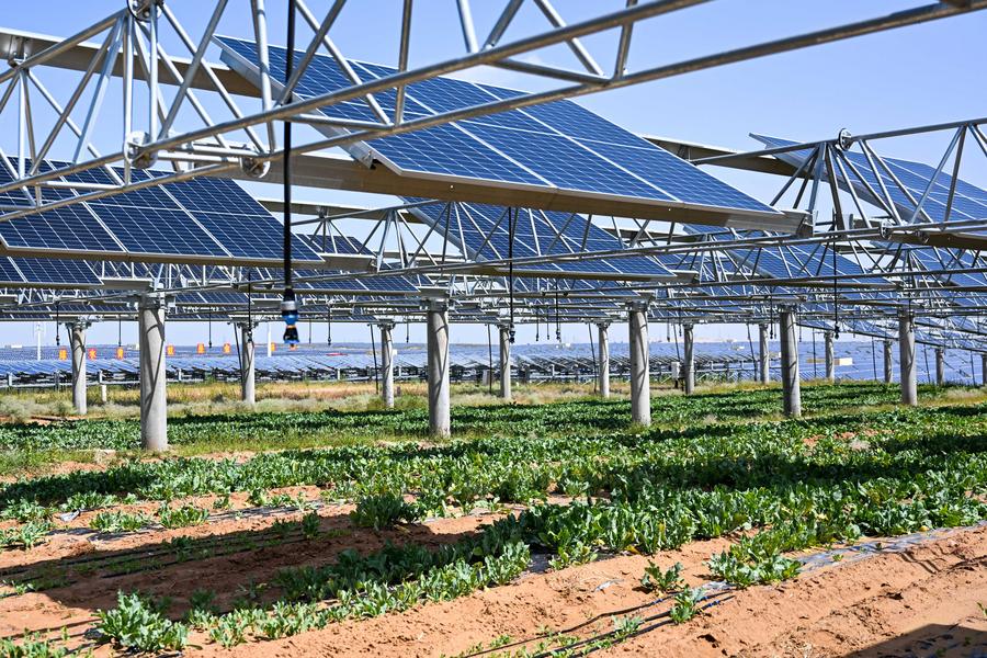 This photo taken on Sept. 3, 2025 shows a view at a photovoltaic and desertification control project in Kubuqi Desert, north China's Inner Mongolia Autonomous Region. (Xinhua/Li Zhipeng)