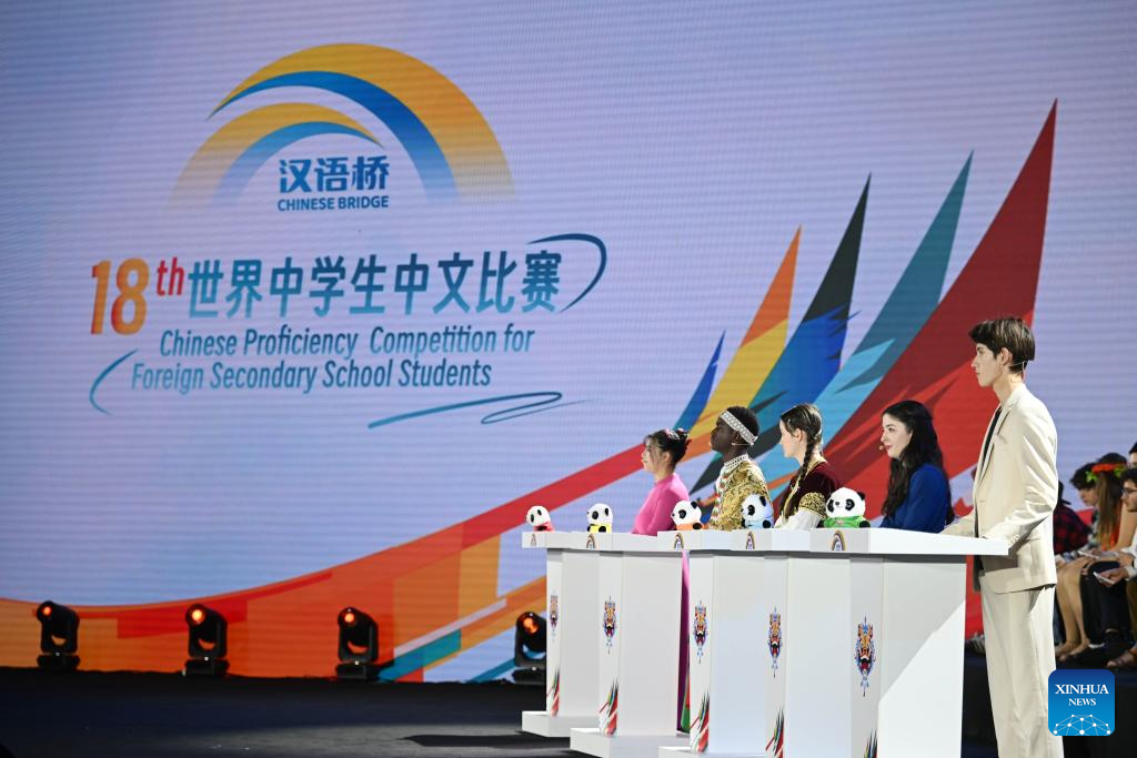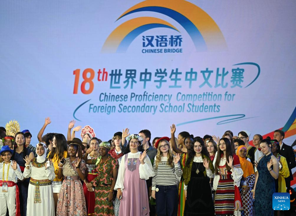This photo taken on Sept. 26, 2025 shows the finals of the 18th "Chinese Bridge" Chinese proficiency competition for foreign secondary school students in north China's Tianjin. The finals of the competition concluded in Tianjin. This year, a total of 119 secondary school students from 102 countries took part in the two-week competition. (Xinhua/Zhao Zishuo)