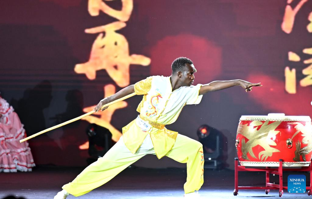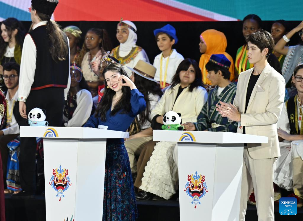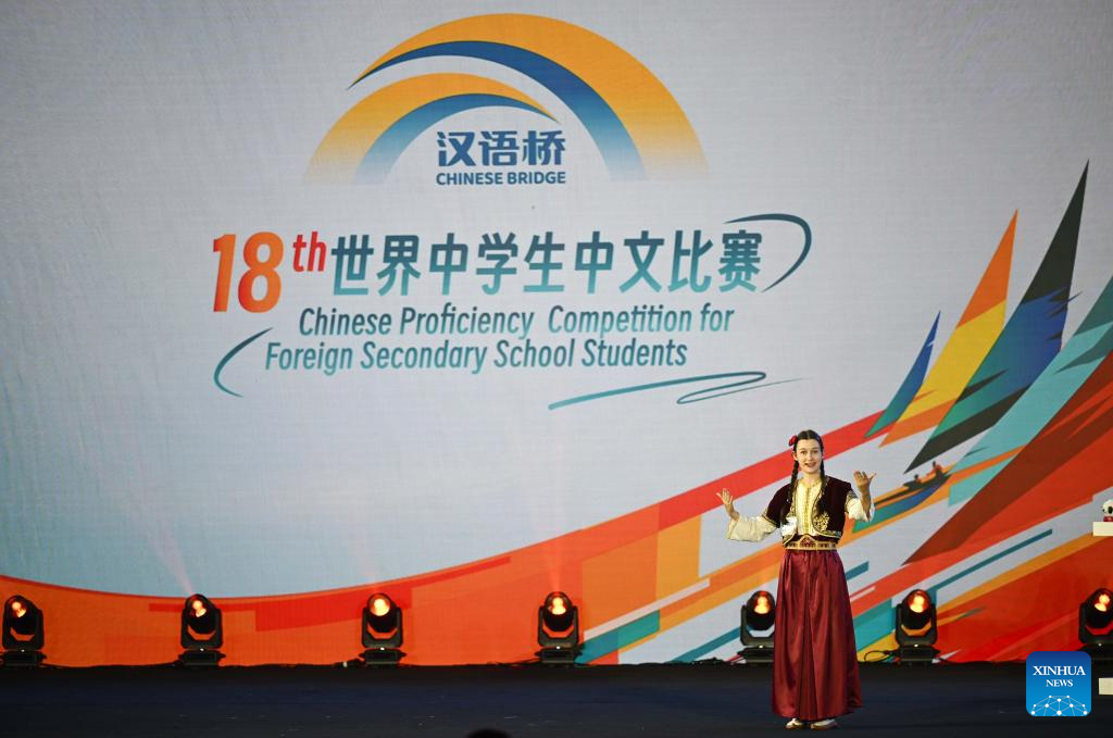 A contestant performs during the finals of the 18th "Chinese Bridge" Chinese proficiency competition for foreign secondary school students in north China's Tianjin, Sept. 26, 2025. The finals of the competition concluded in Tianjin. This year, a total of 119 secondary school students from 102 countries took part in the two-week competition. (Xinhua/Zhao Zishuo)