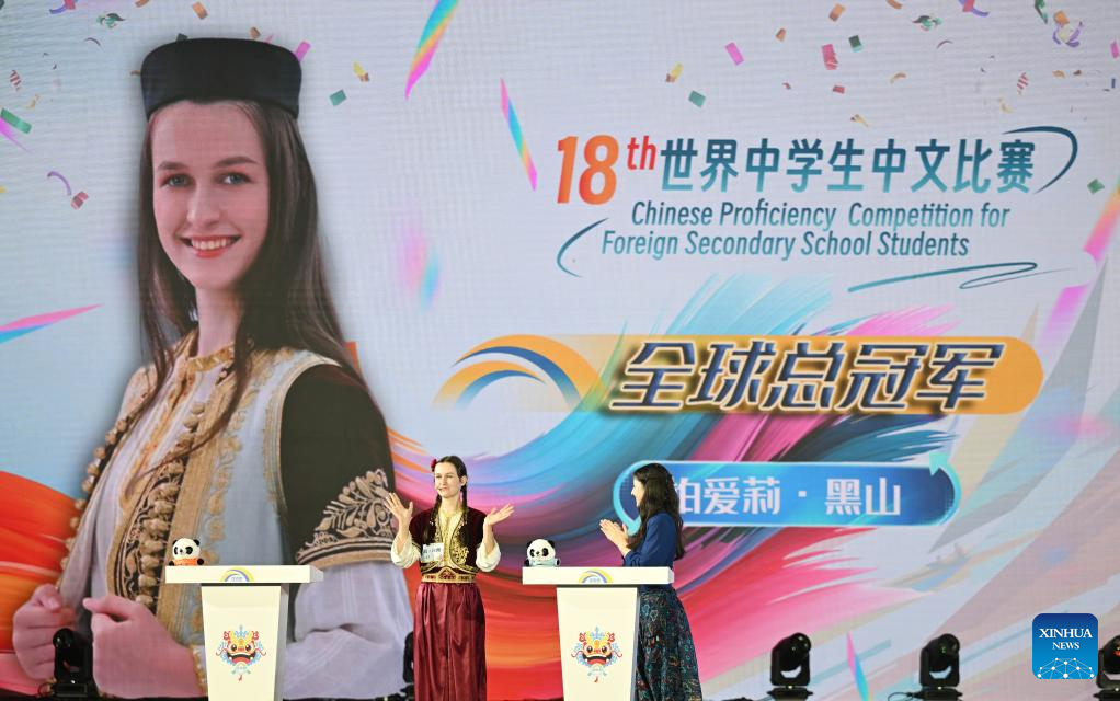 Montenegro's contestant Bogdanovic Alisa (L) waves to audience after winning the global championship during the finals of the 18th "Chinese Bridge" Chinese proficiency competition for foreign secondary school students in north China's Tianjin, Sept. 26, 2025. The finals of the competition concluded in Tianjin. This year, a total of 119 secondary school students from 102 countries took part in the two-week competition. (Xinhua/Zhao Zishuo)