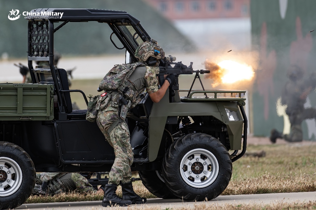 A special operations soldier assigned to the airborne troops under the Chinese PLA Air Force fires at the target while marching forward in a counter-terrorism operating demonstration during the 2025 aviation open-day activities of the Chinese PLA Air Force and Changchun Air Show in Changchun City, northeast China's Jilin Province. (eng.chinamil.com.cn/Photo by Chen Gongyu)