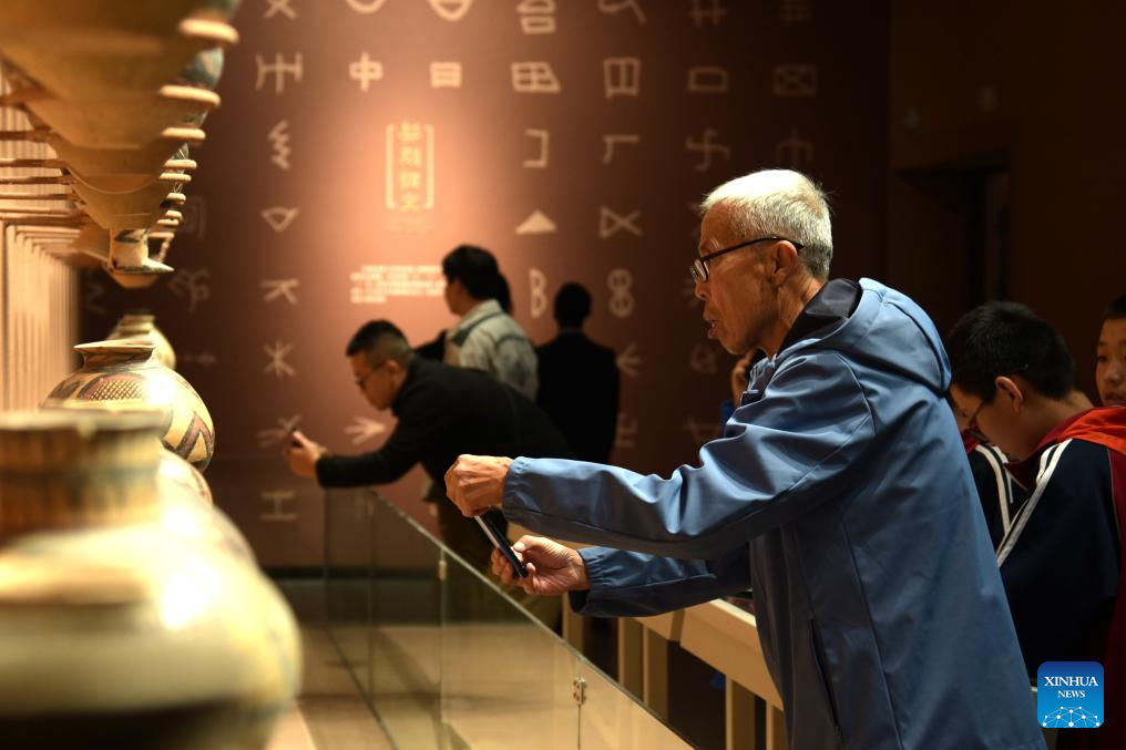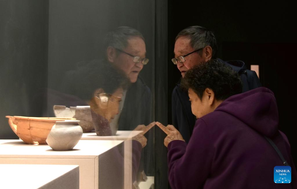 People visit a study and exhibition center for Majiayao culture in Lintao County, Dingxi City, northwest China's Gansu Province, Sept. 26, 2025. The 8th Majiayao Culture Festival kicked off in Lintao County on Friday, featuring thematic study tours, cultural relic exhibitions, painted pottery culture experiences and other activities.
