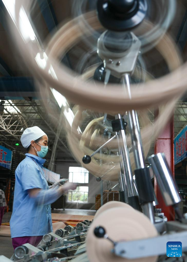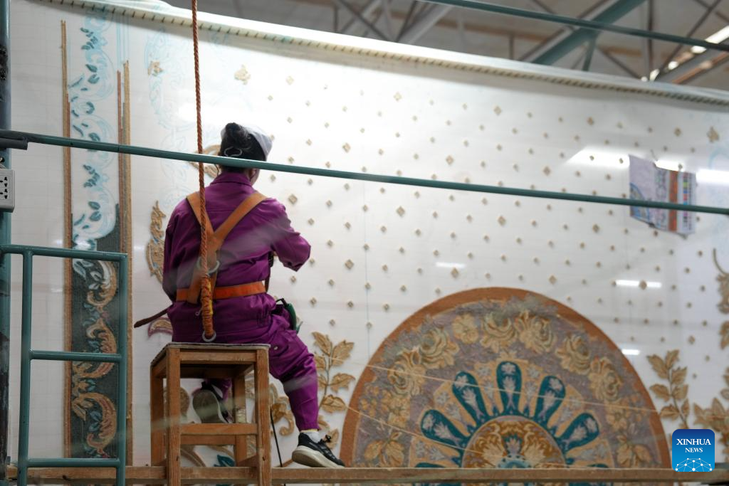 An employee works at a workshop making Tibetan carpets in Shengyuan carpet group in Xining, northwest China's Qinghai Province, Sept. 27, 2025. Tibetan carpet is a traditional handicraft on the Qinghai-Tibetan Plateau with a history of more than 1,000 years. The carpets are essential items for the nomadic people on the plateau to withstand the cold. The fine yak and sheep wool and the delicate weaving skills and patterns made the handmade products popular among overseas and domestic customers. Nowadays, Tibetan carpet has become an industry that injects new momentum into rural revitalization while preserving traditional skills. (Xinhua/Du Xiaowei)