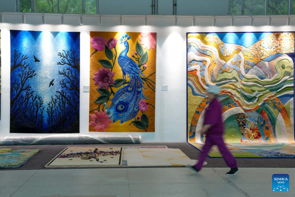 An employee walks past Tibetan carpets displayed at a workshop of Shengyuan carpet group in Xining, northwest China's Qinghai Province, Sept. 27, 2025. Tibetan carpet is a traditional handicraft on the Qinghai-Tibetan Plateau with a history of more than 1,000 years. The carpets are essential items for the nomadic people on the plateau to withstand the cold. The fine yak and sheep wool and the delicate weaving skills and patterns made the handmade products popular among overseas and domestic customers. Nowadays, Tibetan carpet has become an industry that injects new momentum into rural revitalization while preserving traditional skills. (Xinhua/Du Xiaowei)