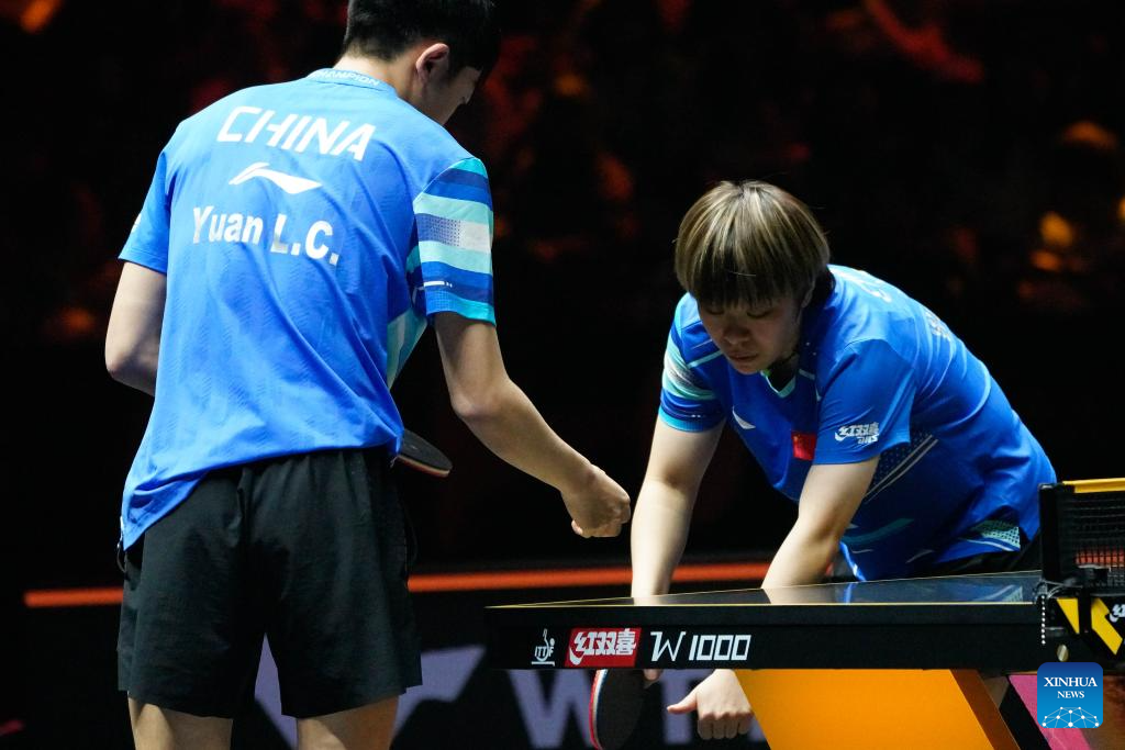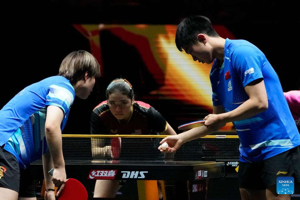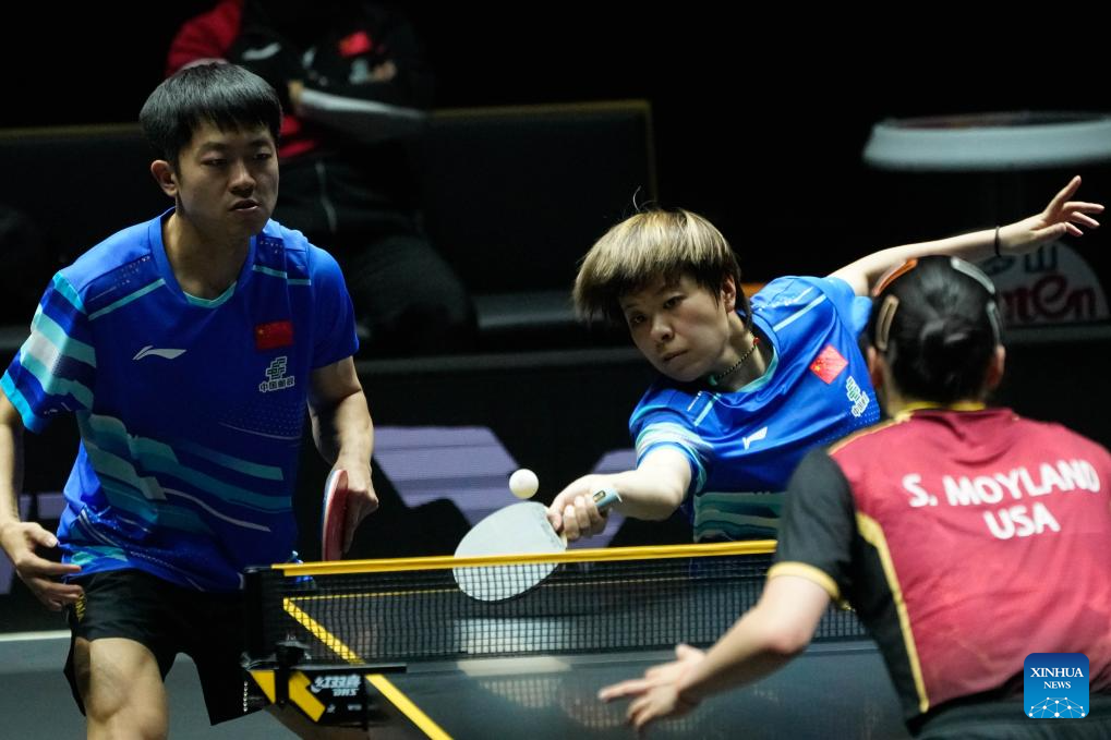 Yuan Licen (L)/Wang Yidi (C) compete during the mixed doulbes round of 32 match between Yuan Licen/Wang Yidi of China and Nandan Naresh/Sally Moyland of the United States at 2025 World Table Tennis (WTT) China Smash in Beijing, China, Sept. 28, 2025. (Xinhua/Xie Han)