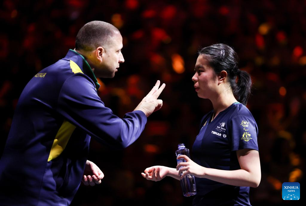 Liu Yangzi (R) reacts during the women's singles first round match between Wang Yidi of China and Liu Yangzi of Australia at the 2025 World Table Tennis (WTT) China Smash in Beijing, China, Sept. 28, 2025. (Xinhua/Wang Kaiyan)