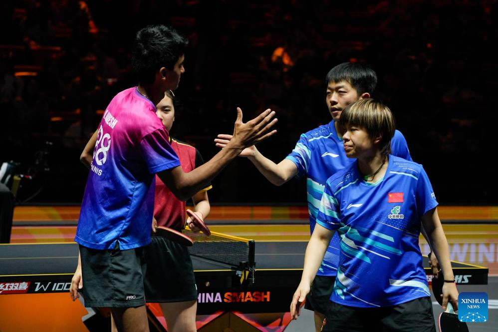 Yuan Licen (rear R)/Wang Yidi (front R) greet Nandan Naresh (front L)/Sally Moyland after the mixed doulbes round of 32 match between Yuan Licen/Wang Yidi of China and Nandan Naresh/Sally Moyland of the United States at 2025 World Table Tennis (WTT) China Smash in Beijing, China, Sept. 28, 2025. (Xinhua/Xie Han)