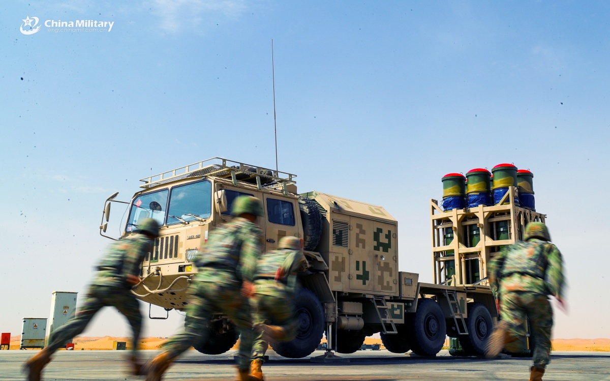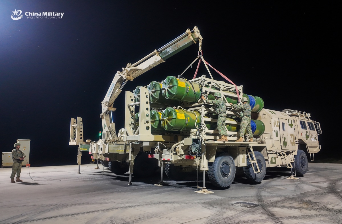 Soldiers assigned to a brigade under the Chinese PLA 76th Group Army hoist and load HQ-16 medium-range air defense missiles onto the missile launching vehicle during a round-the-clock live-fire shooting training exercise in unfamiliar areas on September 17, 2025. (eng.chinamil.com.cn/Photo by Shi Tao)