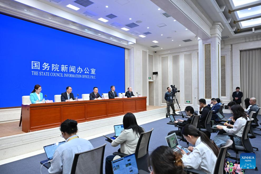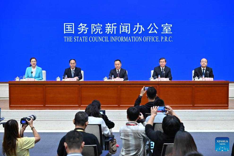 Journalists work at a press conference held by the State Council Information Office (SCIO) on achievements in high-quality development of the water sector during the 14th Five-Year Plan period (2021-2025) in Beijing, capital of China, Sept. 29, 2025. Chinese Minister of Water Resources Li Guoying, Vice Minister of Water Resources Chen Min, and Zhang Xiangwei and Yu Qiyang, both officials of the ministry, attended the press conference here on Monday. (Xinhua/Li Xin)