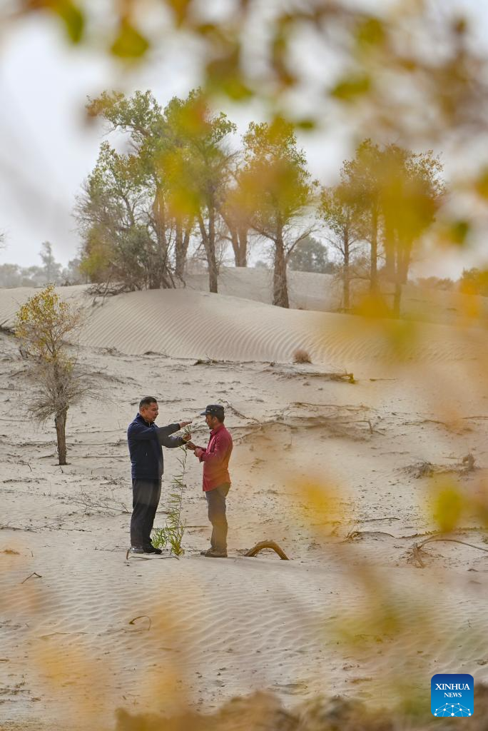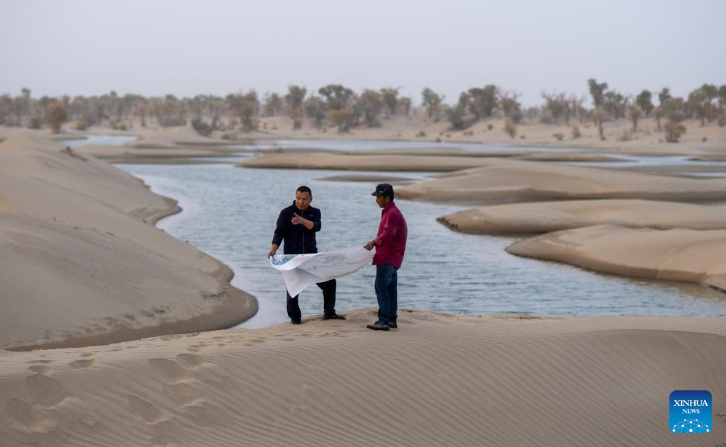 Forest ranger Eli Niyaz (L) and his colleague work beside an artificially excavated ecological canal for flood diversion and water replenishment in Yuli County, Mongolian Autonomous Prefecture of Bayingolin, northwest China's Xinjiang Uygur Autonomous Region, Sept. 19, 2025. (Xinhua/Jiang Wenyao)
