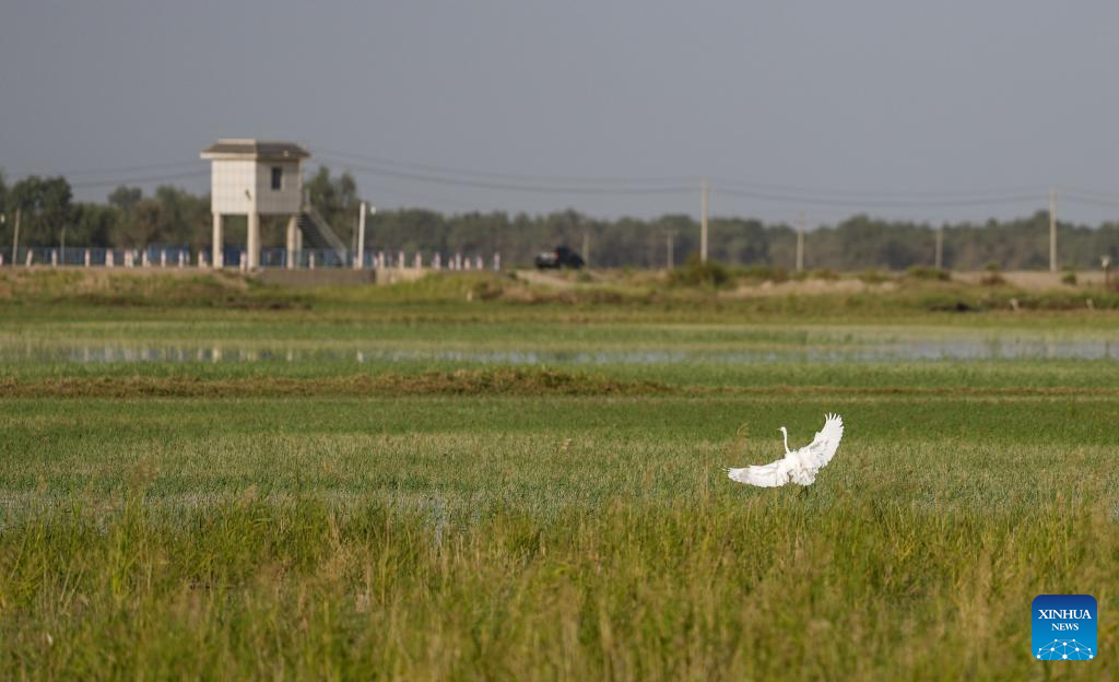 A white egret is pictured in Yuli County, Mongolian Autonomous Prefecture of Bayingolin, northwest China's Xinjiang Uygur Autonomous Region on Sept. 20, 2025. (Xinhua/Jiang Wenyao)