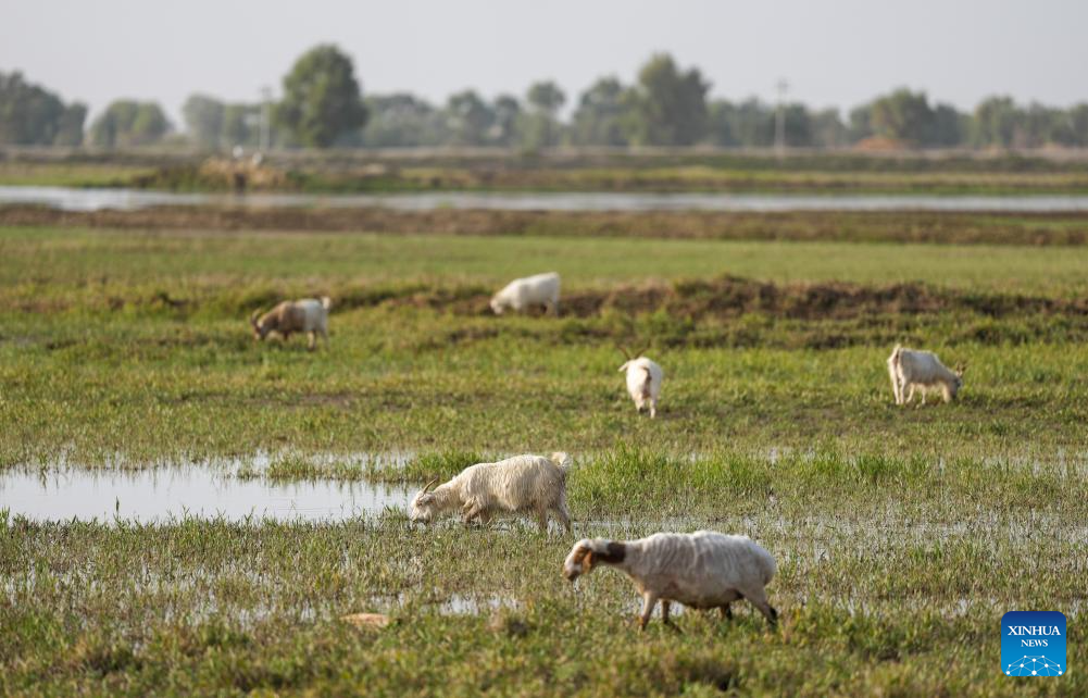 This photo taken on Sept. 20, 2025 shows sheep foraging at a wetland of the Tarim River in Yuli County, Mongolian Autonomous Prefecture of Bayingolin, northwest China's Xinjiang Uygur Autonomous Region. (Xinhua/Jiang Wenyao)