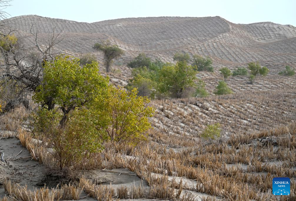 This photo taken on Sept. 19, 2025 shows a view of wild populus euphratica and straw checkerboards in Yuli County, Mongolian Autonomous Prefecture of Bayingolin, northwest China's Xinjiang Uygur Autonomous Region. (Xinhua/Wang Fei)