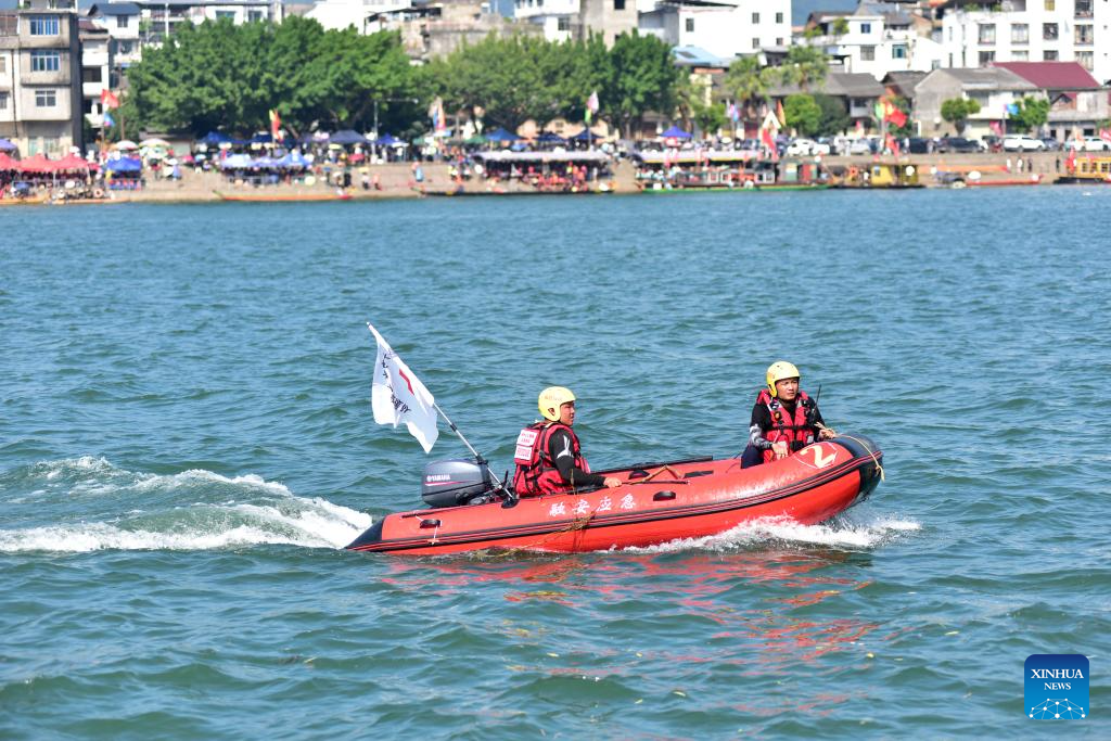 Rescuers patrol the waters for a dragon boat race in Rong'an County, south China's Guangxi Zhuang Autonomous Region, Oct. 2, 2025. Workers from all walks of life have been standing fast at their posts and fulfilling their duties with full dedication during the eight-day National Day and Mid-Autumn Festival holiday. (Photo by Liao Zuping/Xinhua)