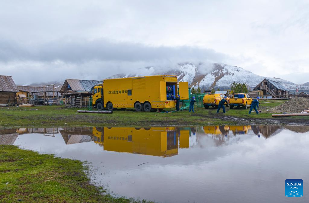 Staff members of State Grid's local branch adjust a power generation vehicle at the Kanas scenic area of Altay, northwest China's Xinjiang Uygur Autonomous Region, Oct. 2, 2025. Workers from all walks of life have been standing fast at their posts and fulfilling their duties with full dedication during the eight-day National Day and Mid-Autumn Festival holiday. (Photo by Nuerbek Nurman/Xinhua)