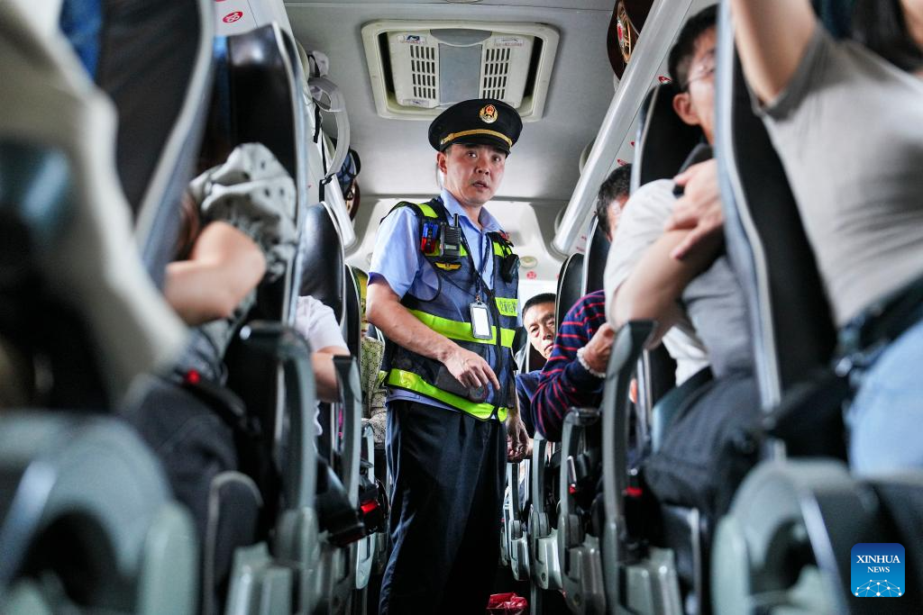 A transportation law enforcement officer inspects a bus in Beibei District of southwest China's Chongqing Municipality, Oct. 2, 2025. Workers from all walks of life have been standing fast at their posts and fulfilling their duties with full dedication during the eight-day National Day and Mid-Autumn Festival holiday. (Photo by Qin Tingfu/Xinhua)