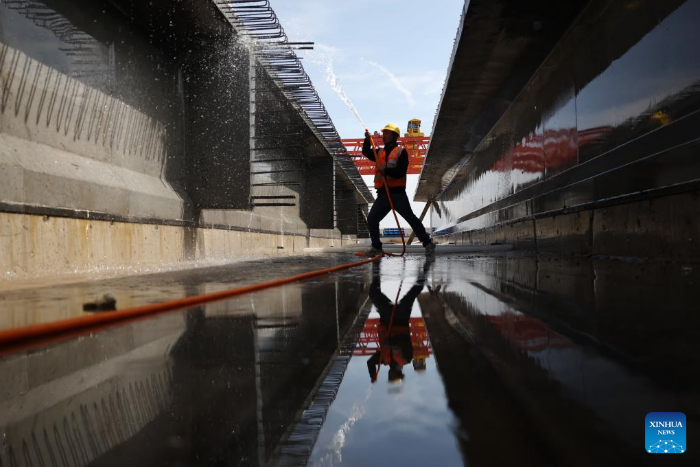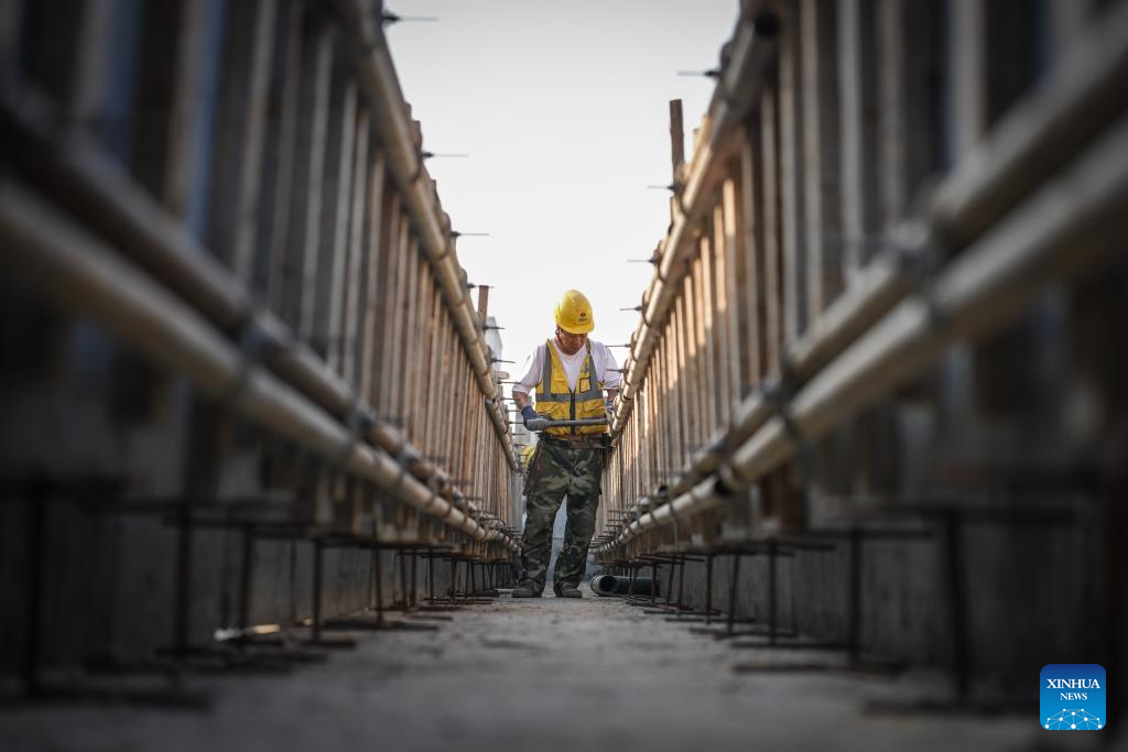 A worker carries out tasks at a construction site in Zhengzhou, central China's Henan Province, Oct. 2, 2025. Workers from all walks of life have been standing fast at their posts and fulfilling their duties with full dedication during the eight-day National Day and Mid-Autumn Festival holiday. (Xinhua/Li Jianan)