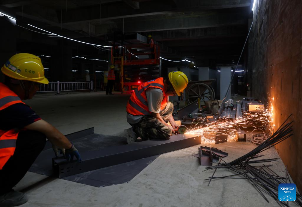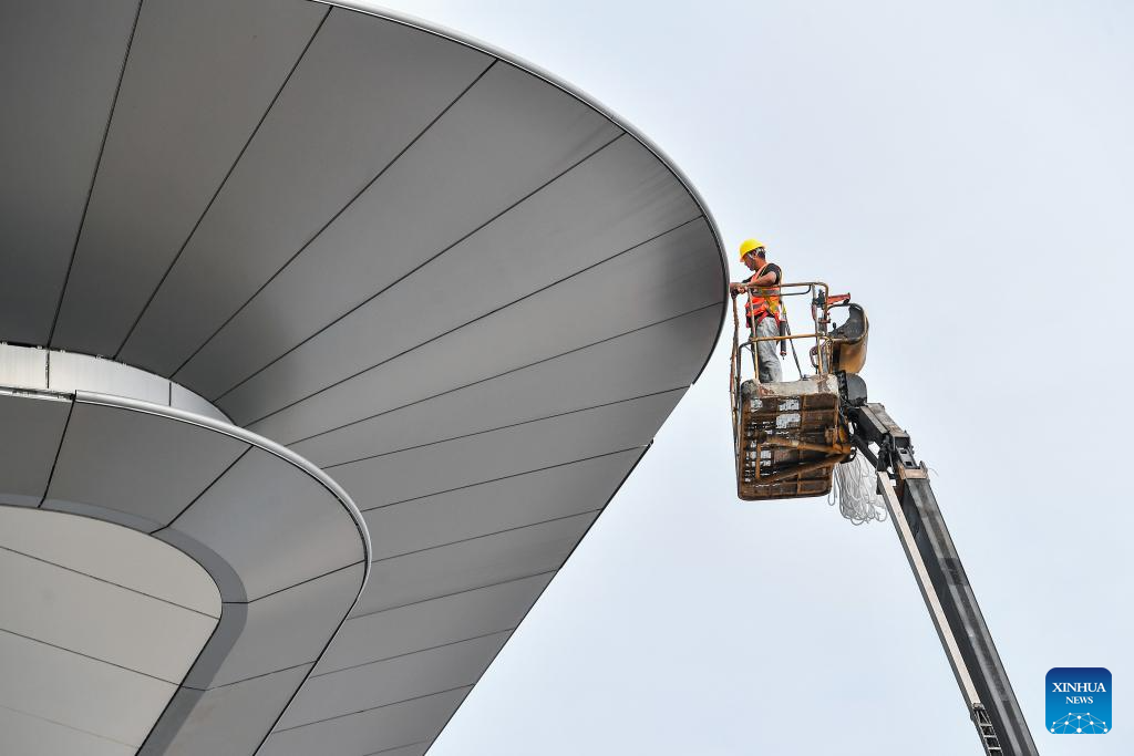 A worker carries out tasks at the construction site of Terminal 3 of Changsha Huanghua International Airport in Changsha, central China's Hunan Province, Oct. 2, 2025. Workers from all walks of life have been standing fast at their posts and fulfilling their duties with full dedication during the eight-day National Day and Mid-Autumn Festival holiday. (Xinhua/Chen Sihan)