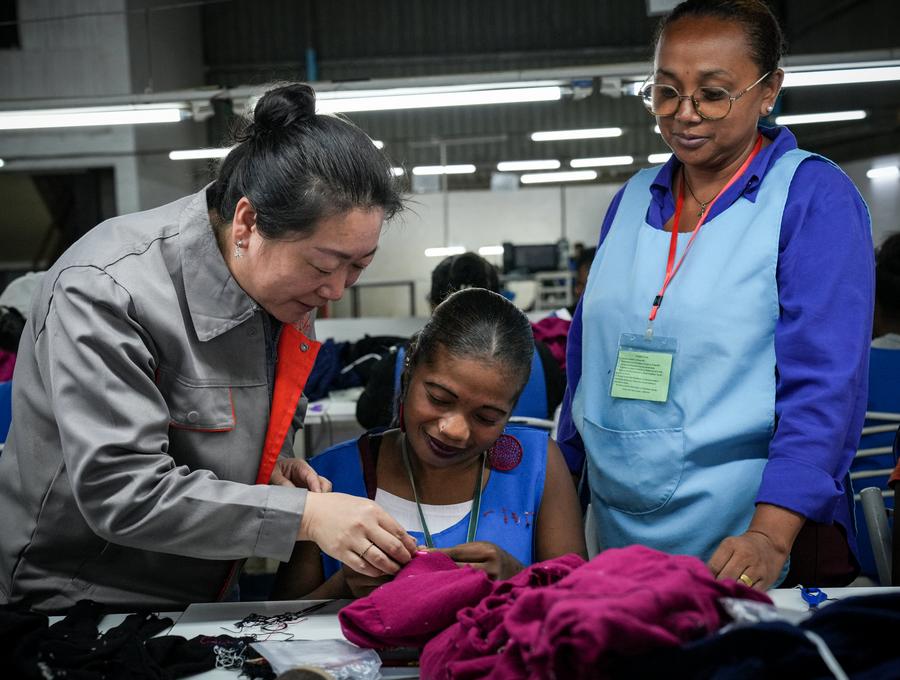 A Chinese staff provides technical guidance to local workers at the Madagascar plant of China's Inner Mongolia King Deer Cashmere Co., Ltd. in Antananarivo, Madagascar, March 28, 2025. (Xinhua/Li Yahui)