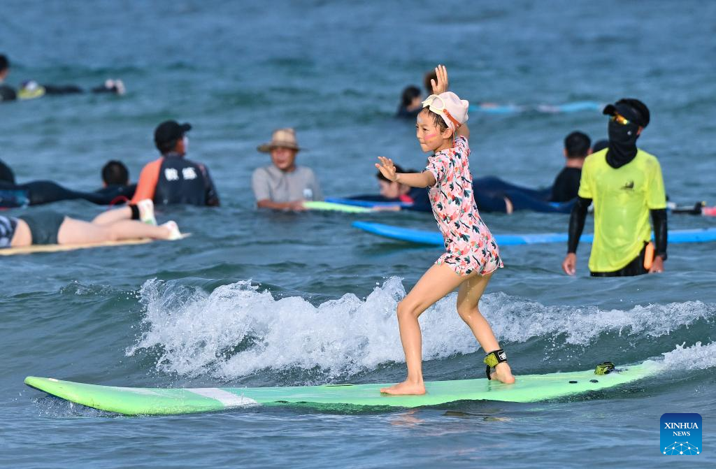 Tourists surf at Riyue Bay in Wanning, S China's Hainan