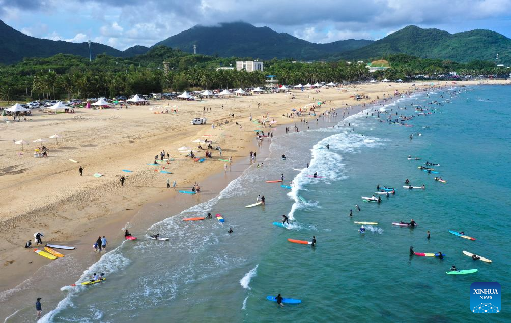 Tourists surf at Riyue Bay in Wanning, south China's Hainan Province, Oct. 2, 2025. Surfing has become a symbol of Wanning thanks to its unique geographical and climatic advantages. (Xinhua/Guo Cheng)