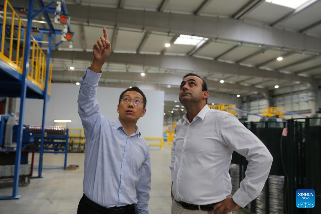 Liu Jianlong (L), equipment manager of China's Hengtong Group in Portugal, discusses technical issues with Alcobre's Chief Operating Officer Carlos Granja in the factory of Alcobre in Ovar, Portugal, Oct. 3, 2025. (Xinhua/Xun Wei)