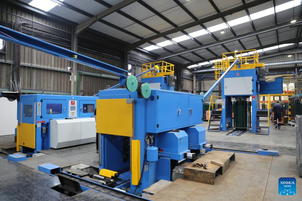 This photo taken on Oct. 3, 2025 shows new wire drawing machine in the factory of Alcobre in Ovar, Portugal. (Xinhua/Xun Wei)