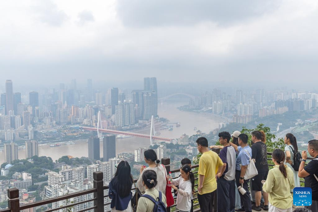 Tourists enjoy the city view at a scenic area in southwest China's Chongqing Municipality, Oct. 2, 2025. (Xinhua/Huang Wei)