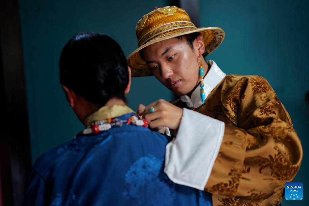 Padruk Tendar (R) puts on costumes designed by himself in Lhasa, southwest China's Xizang Autonomous Region, Sept. 9, 2025. (Xinhua/Jigme Dorje)