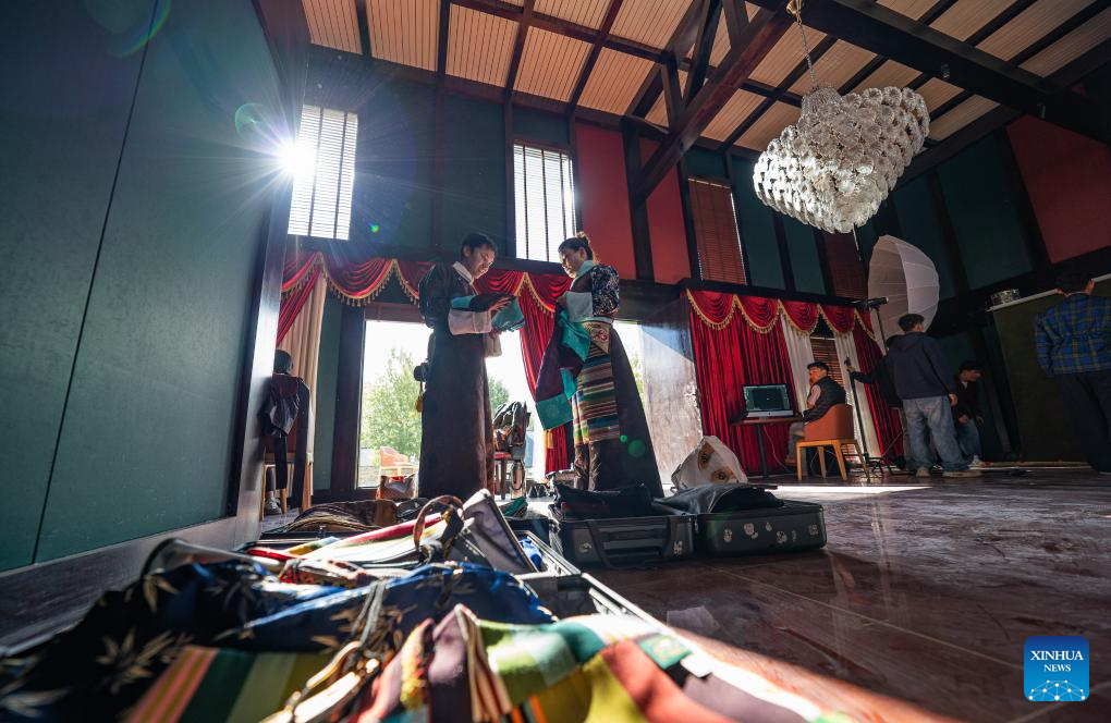 Padruk Tendar (1st R) adjusts Tibetan costume accessories for a model in Lhasa, southwest China's Xizang Autonomous Region, Sept. 9, 2025. (Xinhua/Jigme Dorje)