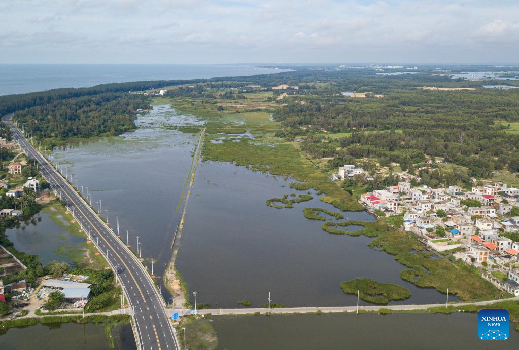 An aerial drone photo taken on Oct. 3, 2025 shows a view of the Haiwei National Wetland Park in Changjiang Li Autonomous County, south China's Hainan Province. Following ecological restoration and facility construction, Haiwei National Wetland Park has recently reopened to the public. The park serves as a crucial habitat for migratory birds.