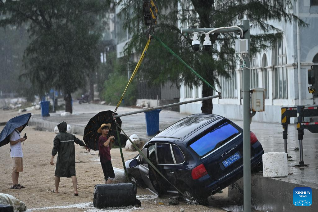 An overturned vehicle is lifted in Beihai, south China's Guangxi Zhuang Autonomous Region, Oct. 6, 2025. Typhoon Matmo, the 21st named storm of the 2025 Pacific typhoon season, made landfall along the coast of Guangxi on Monday, bringing strong winds and heavy rainfall. (Photo by Li Junguang/Xinhua)