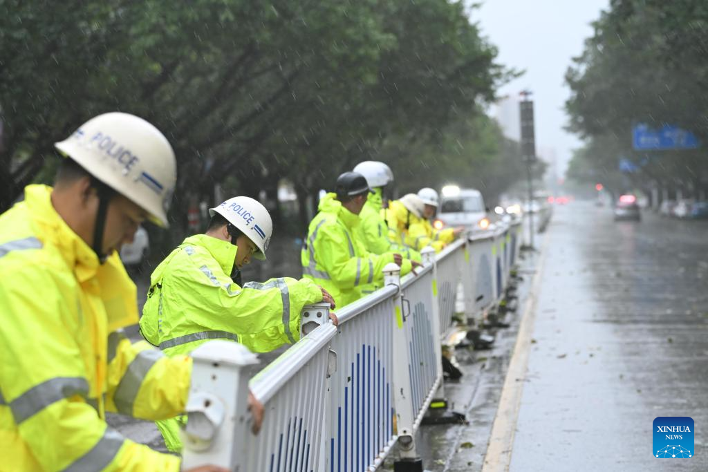 Police officers restore railings in Beihai, south China's Guangxi Zhuang Autonomous Region, Oct. 6, 2025. Typhoon Matmo, the 21st named storm of the 2025 Pacific typhoon season, made landfall along the coast of Guangxi on Monday, bringing strong winds and heavy rainfall. (Photo by Li Junguang/Xinhua)