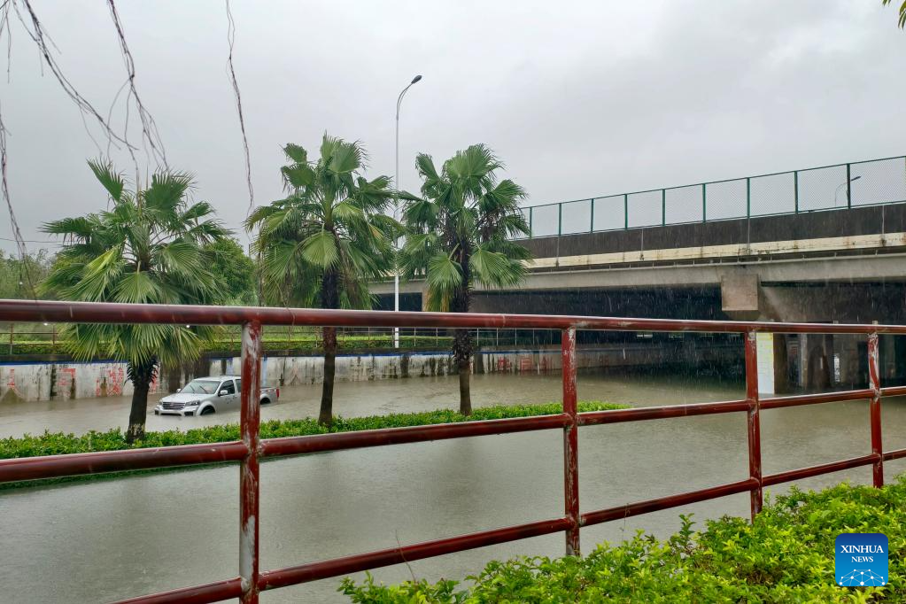 This photo taken on Oct. 6, 2025 shows a waterlogged area in Qinzhou City, south China's Guangxi Zhuang Autonomous Region. Typhoon Matmo, the 21st named storm of the 2025 Pacific typhoon season, made landfall along the coast of Guangxi on Monday, bringing strong winds and heavy rainfall. (Photo by Ao Shuaichang/Xinhua)