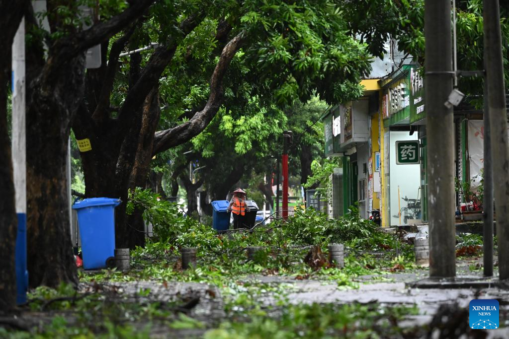 Workers clean up the street in Beihai, south China's Guangxi Zhuang Autonomous Region, Oct. 6, 2025. Typhoon Matmo, the 21st named storm of the 2025 Pacific typhoon season, made landfall along the coast of Guangxi on Monday, bringing strong winds and heavy rainfall. (Photo by Li Junguang/Xinhua)
