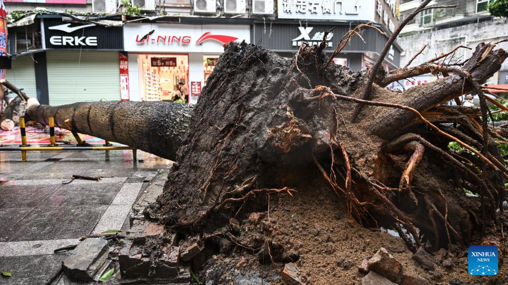 A fallen tree is pictured in Qinzhou City, south China's Guangxi Zhuang Autonomous Region, Oct. 6, 2025. Typhoon Matmo, the 21st named storm of the 2025 Pacific typhoon season, made landfall along the coast of Guangxi on Monday, bringing strong winds and heavy rainfall. (Xinhua/Zhang Ailin)