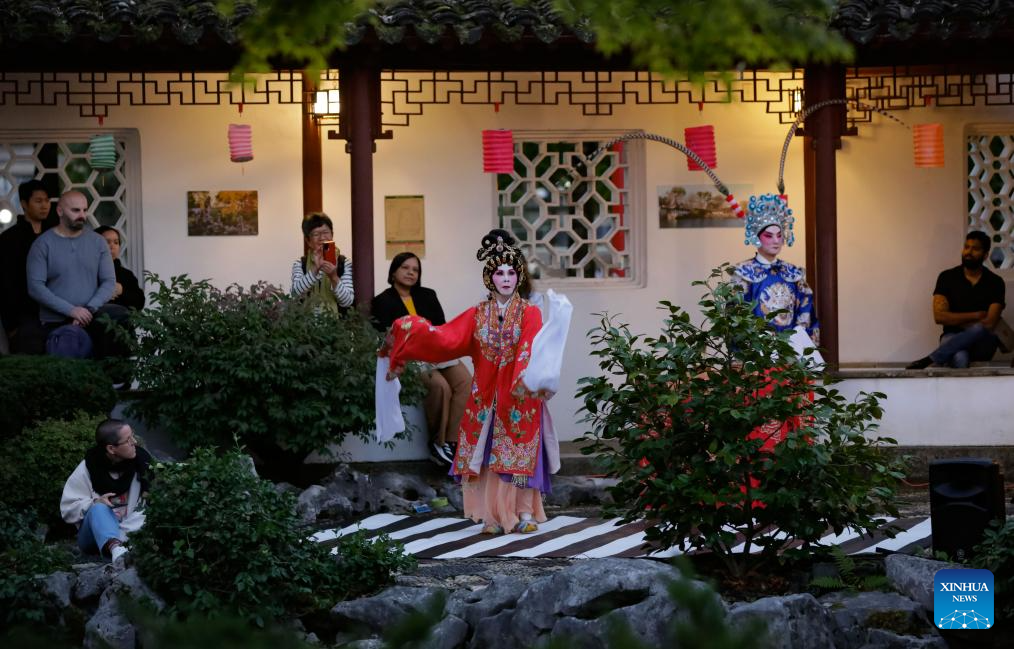 People watch a Cantonese opera performance during a Mid-Autumn Festival event at Dr. Sun Yat-Sen Classical Chinese Garden in Vancouver, British Columbia, Canada, Oct. 5, 2025. (Photo by Liang Sen/Xinhua)