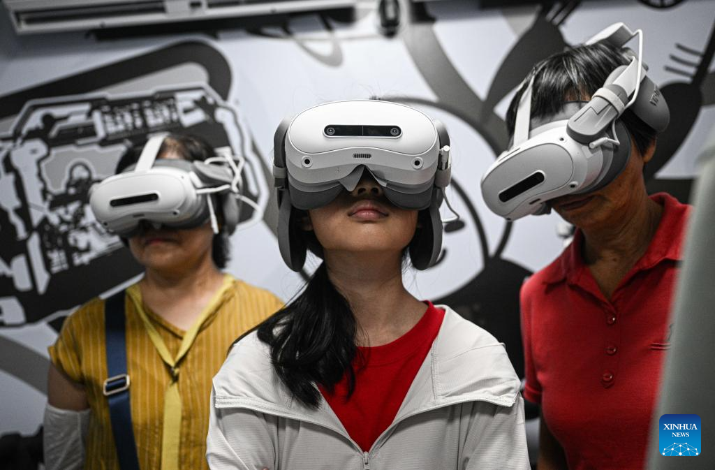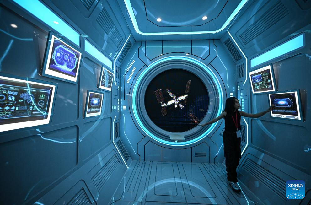 People experience MR technologies at the Wenchang Aerospace Science and Education Center in Wenchang, south China's Hainan Province, Oct. 7, 2025. The upgrade project of the Wenchang Aerospace Science and Education Center is nearing completion. In preparation for its official opening, the center is open to the public free of charge for a limited time, allowing visitors to experience its operation and services firsthand. Following the renovation, the exhibition now features immersive experiences in aerospace history, rocket launches, space science and future exploration. (Xinhua/Pu Xiaoxu)