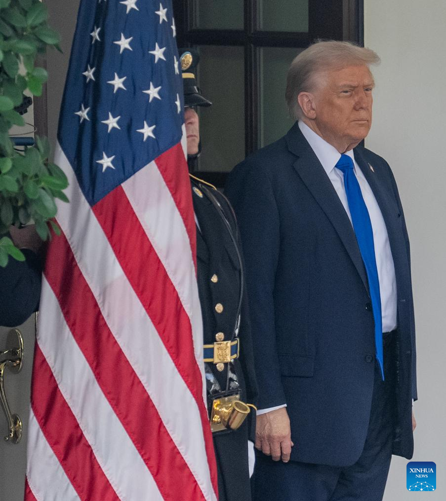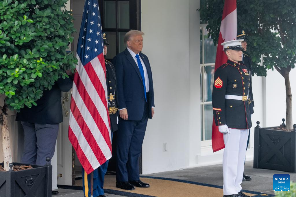 U.S. President Donald Trump waits to welcome Canadian Prime Minister Mark Carney at the White House in Washington, D.C., the United States, on Oct. 7, 2025. U.S. President Donald Trump said Tuesday that some furloughed federal employees may not receive back pay once the government reopens, following earlier threats to lay off federal workers during shutdown. (Xinhua/Hu Yousong)