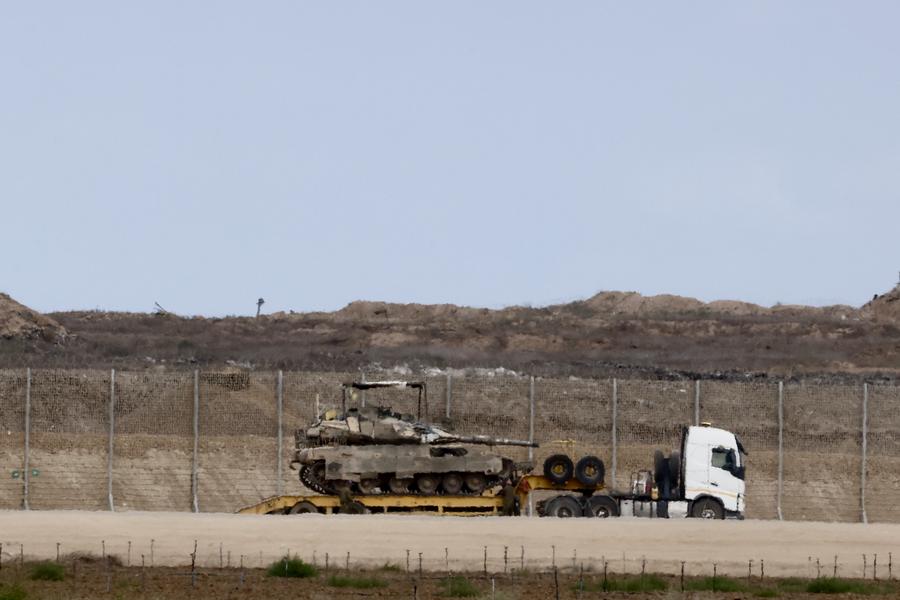 Israeli military vehicles are seen on the Israeli border with Gaza on Oct. 9, 2025. (Photo by Jamal Awad/Xinhua)