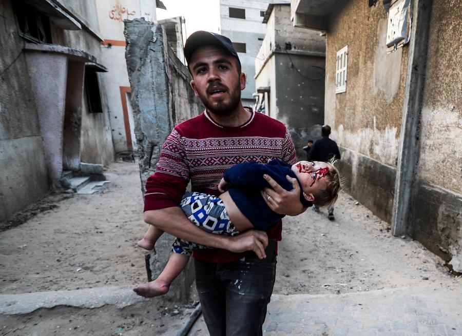 A man holds an injured girl in Jabalia refugee camp, northern Gaza Strip, April 17, 2025. (Photo by Mahmoud Zaki/Xinhua)