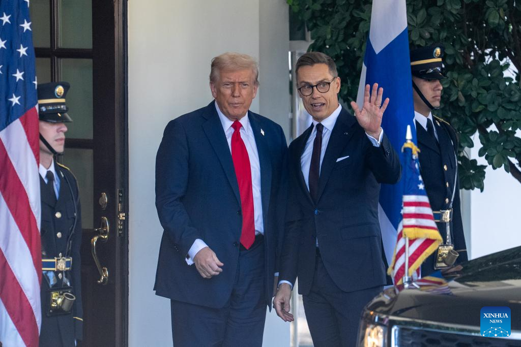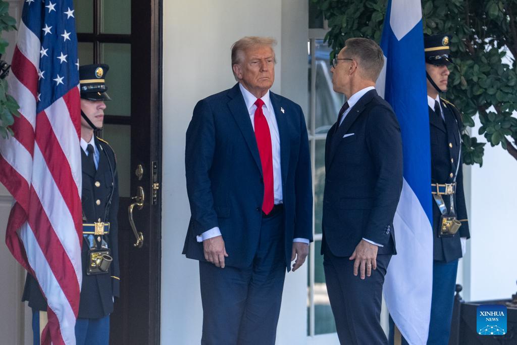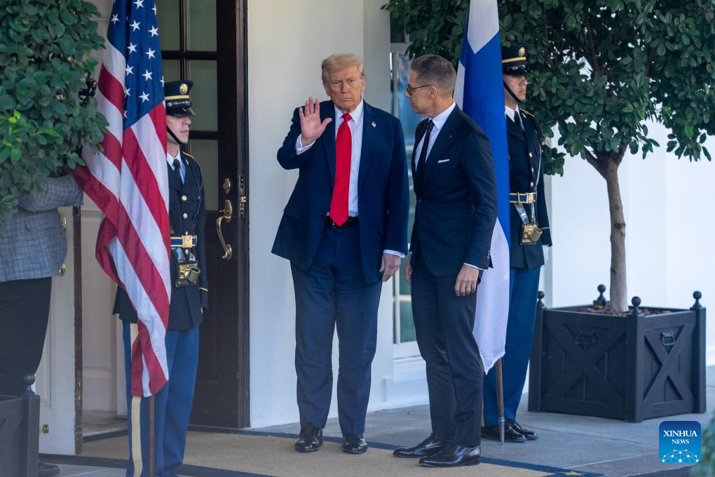 U.S. President Donald Trump (L) welcomes Finnish President Alexander Stubb (2nd R) at the White House in Washington, D.C., the United States, Oct 9, 2025. (Xinhua/Hu Yousong)