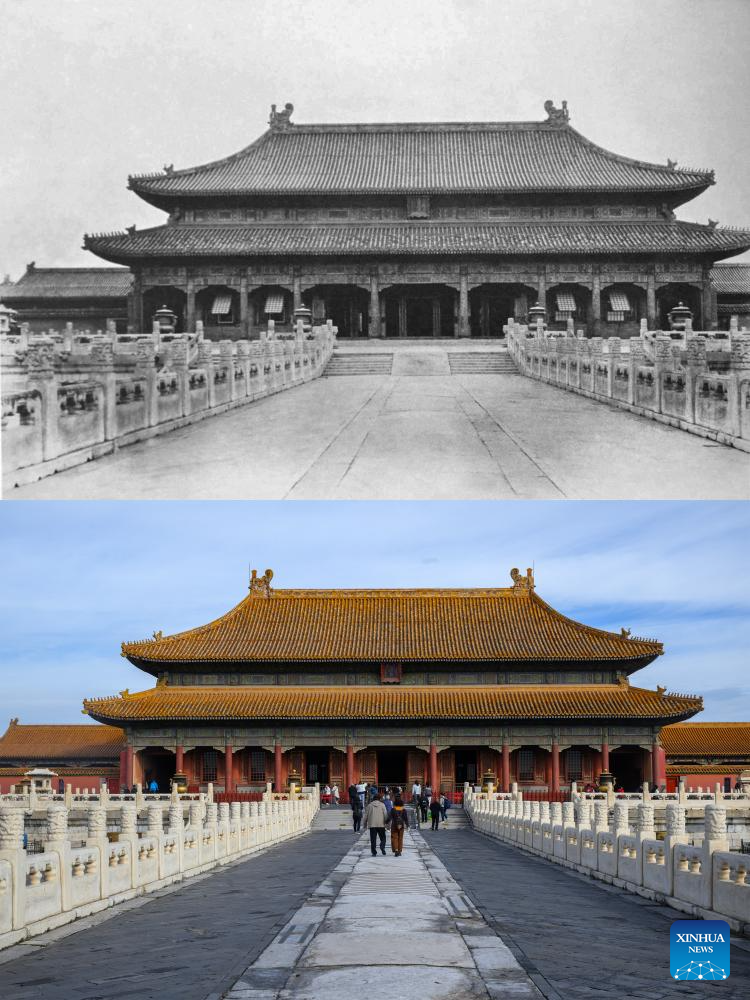 This combo photo shows the Hall of Preserving Harmony (Baohe dian) of the Palace Museum in the early 20th century (above, provided by the Palace Museum) and on Oct. 10, 2025 (below, photo by Xinhua photographer Jin Liangkuai) in Beijing, capital of China. This year marks the 100th anniversary of the founding of the Palace Museum. On Oct. 10, 1925, the Palace Museum was established based on the Forbidden City, once the imperial palaces of the Ming (1368-1644) and Qing (1644-1911) dynasties, and opened to the public for the first time, along with its priceless imperial art collections. Today, the museum ranks among the most visited museums in the world. In 2009, the attendance surpassed 10 million for the first time, with the figure exceeding 17.6 million in 2024. (Xinhua)