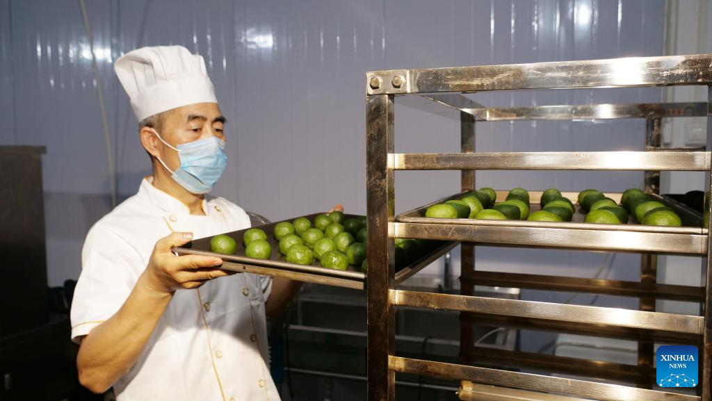 A staff member makes matcha mooncakes at a food company in Jiangkou County, southwest China's Guizhou Province, Sept. 3, 2025. (Xinhua)