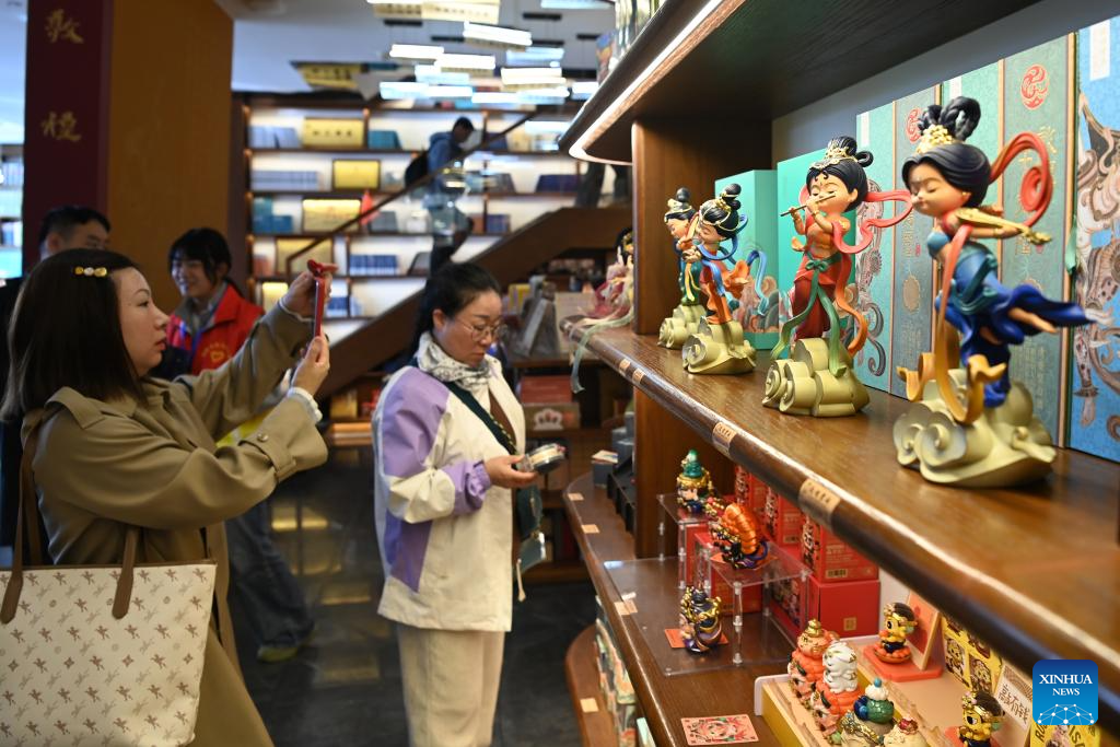 Tourists select cultural and creative products at the Dunhuang Book Center in Dunhuang, northwest China's Gansu Province, Oct. 11, 2025. In recent years, Dunhuang has advanced the development of immersive cultural and tourism experience projects. By renovating unused buildings, new cultural landmarks centered on Dunhuang culture have been created, including the Dunhuang Book Center, Dunhuang Press, and Dunhuang Unbounded art gallery. These cultural attractions combining cultural consumption, art exhibitions, interactive experiences, and social activities attract a large number of visitors. (Xinhua/Fan Peishen)