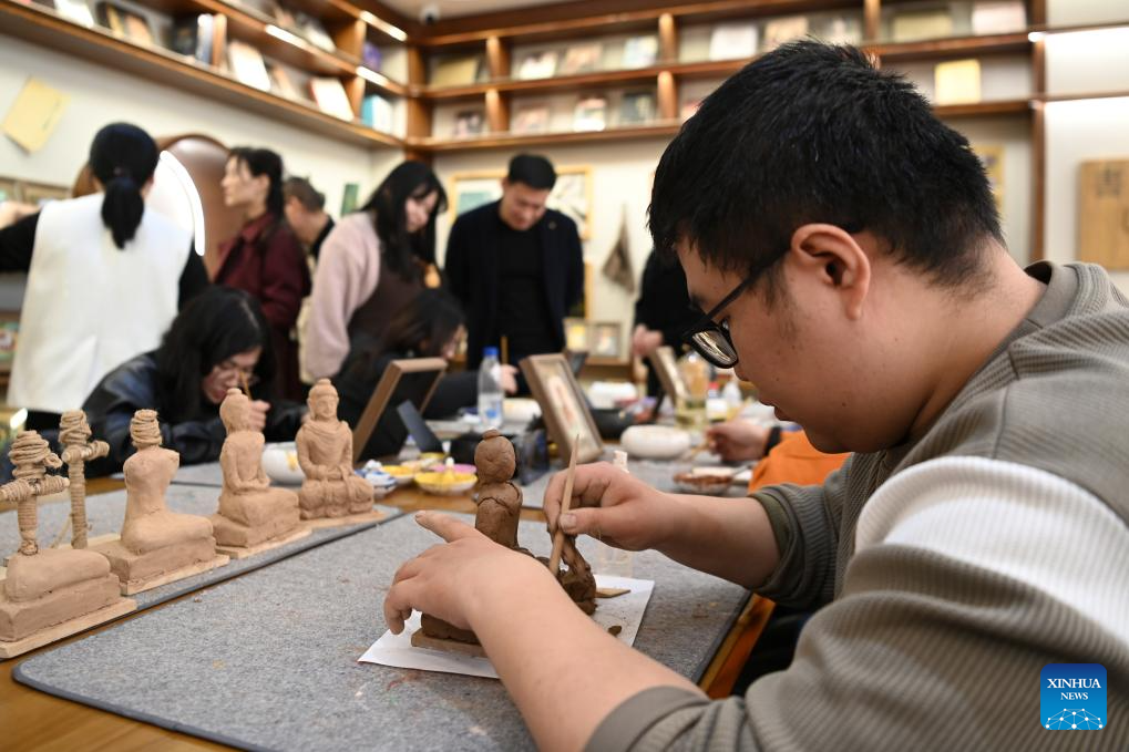 A tourist tries clay sculpture making at the Dunhuang Book Center in Dunhuang, northwest China's Gansu Province, Oct. 11, 2025. In recent years, Dunhuang has advanced the development of immersive cultural and tourism experience projects. By renovating unused buildings, new cultural landmarks centered on Dunhuang culture have been created, including the Dunhuang Book Center, Dunhuang Press, and Dunhuang Unbounded art gallery. These cultural attractions combining cultural consumption, art exhibitions, interactive experiences, and social activities attract a large number of visitors. (Xinhua/Fan Peishen)