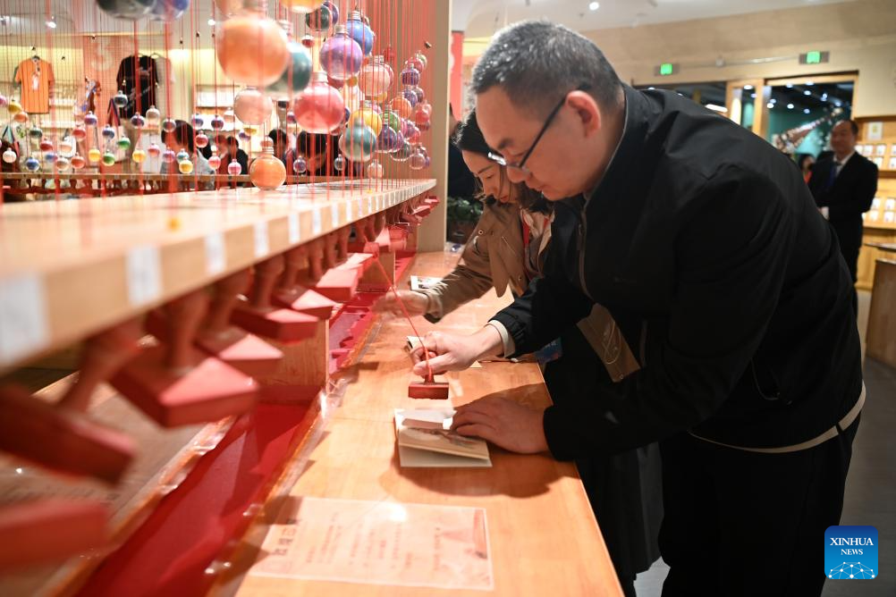 Tourists try stamping at the Dunhuang Press in Dunhuang, northwest China's Gansu Province, Oct. 11, 2025. In recent years, Dunhuang has advanced the development of immersive cultural and tourism experience projects. By renovating unused buildings, new cultural landmarks centered on Dunhuang culture have been created, including the Dunhuang Book Center, Dunhuang Press, and Dunhuang Unbounded art gallery. These cultural attractions combining cultural consumption, art exhibitions, interactive experiences, and social activities attract a large number of visitors. (Xinhua/Fan Peishen)