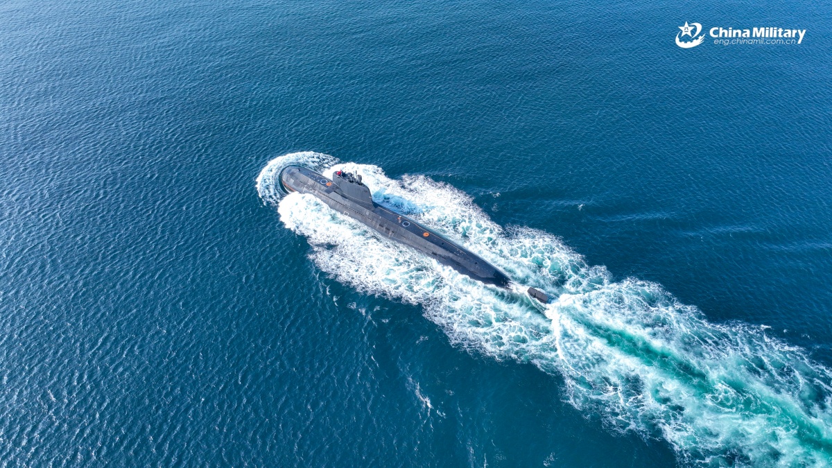 A submarine attached to a flotilla under the Chinese PLA Navy steams towards the designated area during a combat training exercise on September 25, 2025. (eng.chinamil.com.cn/Photo by Zhang Nan)