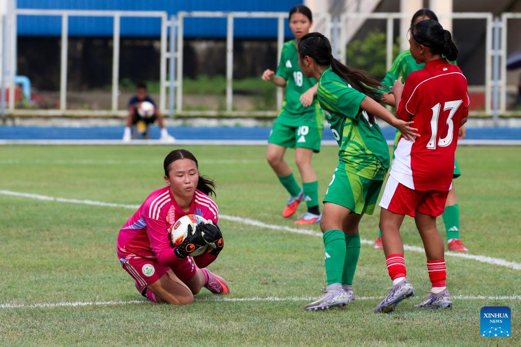 Chong Weng Lam (L), goalkeeper of China's Macao makes a save during the AFC U17 Women's Asian Cup 2026 China 2026 qualifier between China's Macao and Indonesia in Yangon, Myanmar, Oct. 13, 2025. (Xinhua/Myo Kyaw Soe)