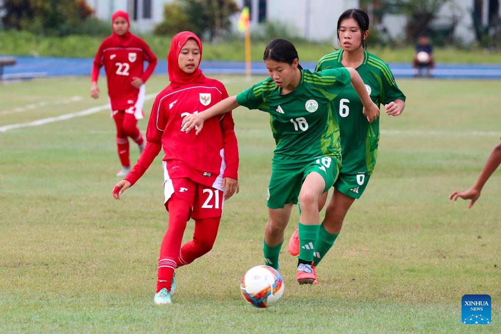 Players of Indonesia celebrate scoring during the AFC U17 Women's Asian Cup 2026 China 2026 qualifier between China's Macao and Indonesia in Yangon, Myanmar, Oct. 13, 2025. (Xinhua/Myo Kyaw Soe)
